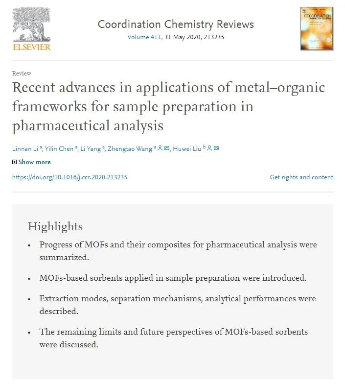 近日,beat365中药研究所王峥涛团队的综述论文《金属-有机框架材料在药物分析样品前处理中的研究进展(Recent advances in applications of metal–organic frameworks for sample preparation in pharmaceutical analysis, DOI: 10.1016/j.ccr.2020.213235)》在爱思唯尔(Elsevier)出版的国际知名化学期刊《配位化学评论》(Coordination Chemistry Reviews,影响因子13.476)发表。该文系统总结、评述了近年来金属-有机框架材料(Metal–organic frameworks,MOFs)及其复合材料在药物分析样品前处理中的最新进展、代表性应用及其展望,为复杂样品(包括中药、天然药物)中微量、痕量活性成分的分离、分析提供了重要科学参考资料。