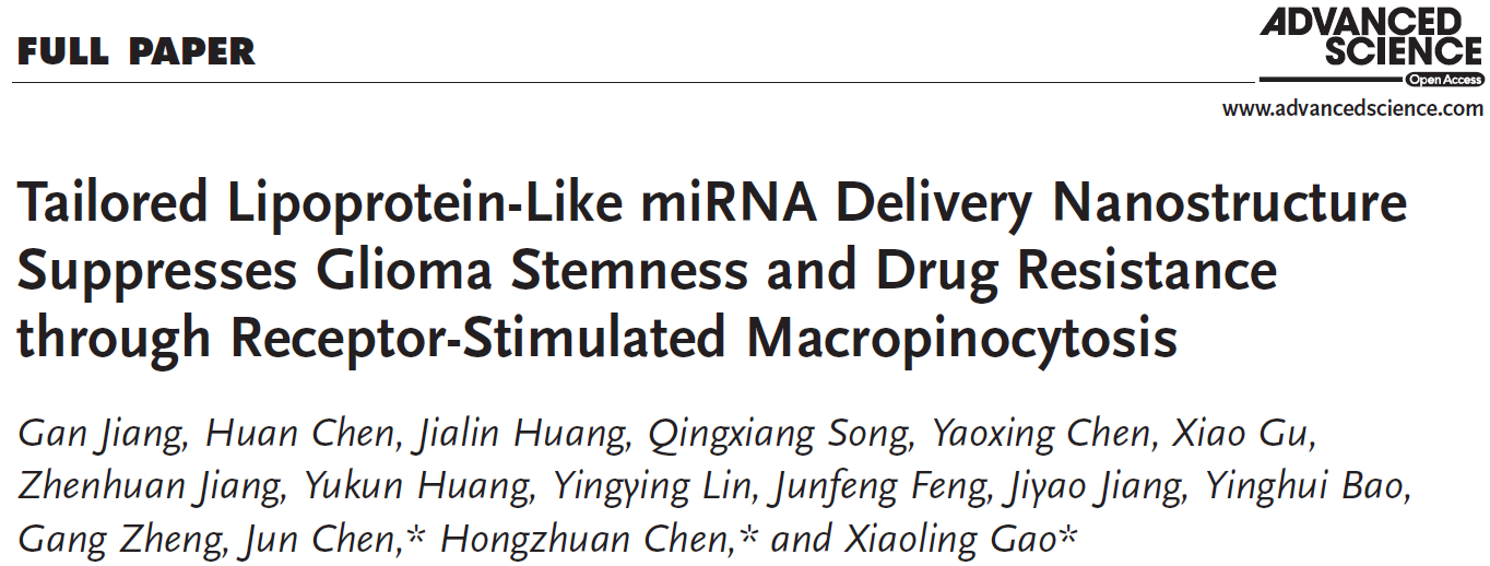 近日,beat365陈红专教授团队在国际知名期刊Advanced Science(《尖端科学》)发表题为“Tailored Lipoprotein‐Like miRNA Delivery Nanostructure Suppresses Glioma Stemness and Drug Resistance through Receptor‐Stimulated Macropinocytosis”的文章,并入选该期刊封面论文之一。该研究综合运用肿瘤干细胞,仿生纳米和microRNA等手段探索神经胶质瘤的药理学调控和干预新策略。Advanced Science是Wiley旗下高质量开放获取期刊(影响因子15.8),刊载覆盖材料科学、物理、化学、医学、生命科学等交叉学科领域的基础和应用研究。