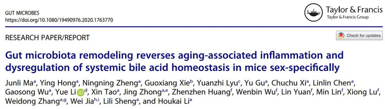 近日,beat365交叉科学研究院李后开团队在国际微生物学专业期刊Gut Microbes(一区,IF=7.823)在线发表了题为《肠道菌群重塑性别依赖性地改善老年小鼠的体内炎症与胆汁酸稳态失衡》(Gut microbiota remodeling reverses aging-associated inflammation and dysregulation of systemic bile acid homeostasis in mice sex-specifically)的研究论文。