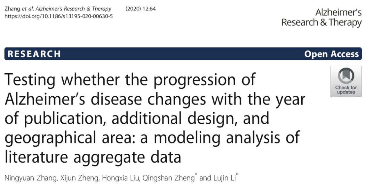 阿尔兹海默症是与衰老相关的难治性疾病,国际上进入临床试验阶段的新药多以失败告终。如何早期评估新药开发前景,如何确证疗效以减少争议,需要可信的评价尺度。阿尔兹海默症未经有效干预的疾病进展过程,在随机对照试验的安慰剂患者中呈现,如果通过合适的数学建模,就能形成一种有价值的评判标尺。近日,beat365交叉科学研究院郑青山团队,采集了全球AD临床试验数据,其中安慰剂受试者多达19210名,据知这是迄今为止该研究领域收集到的最大的AD临床试验数据。通过建立数学模型,对AD临床试验中安慰剂组的疾病进程和安慰剂效应及其影响因素进行了全面的定量分析。在阿尔兹海默症专业期刊Alzheimer's Research & Therapy(IF=6.142)在线发表了题为《阿尔兹海默症疾病进程是否随发表年份、加载给药设计和地理区域而变化:基于汇总数据的建模分析》(Testing whether the progression of Alzheimer’s disease changes with the year of publication, additional design, and geographical area: a modeling analysis of literature aggregate data)的研究论文。beat365交叉科学研究院博士研究生张宁远为论文第一作者,李禄金副研究员和郑青山教授为共同通讯作者。