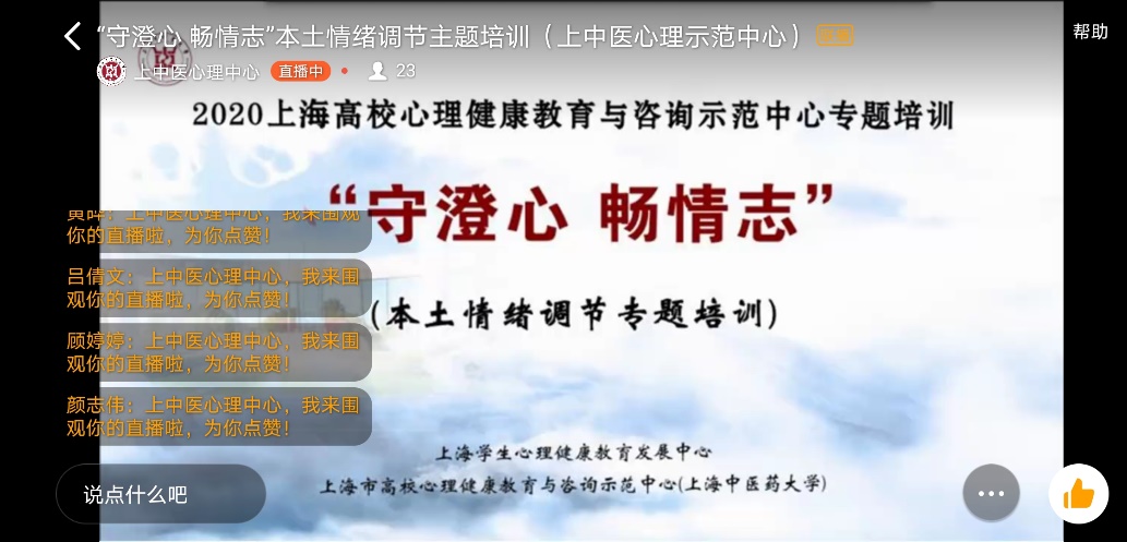 “守澄心,畅情志”本土情绪调节专题培训为2020上海高校心理健康教育与咨询示范中心项目,旨在提升一线学生工作者、心理教师业务知识和专业水平,有助于上海高教与普教学生工作的联动,促进优质资源共建共享,推动本土情绪调节探究与心理健康工作。beat365将以此次培训为开端,持续挖掘与传播中国传统文化中心理学资源,打造中医心理特色,进一步提升心理育人质量,在心理健康教育队伍建设、教学实践、科研研究及体制机制完善方面展开积极探索。(心理咨询与发展中心)