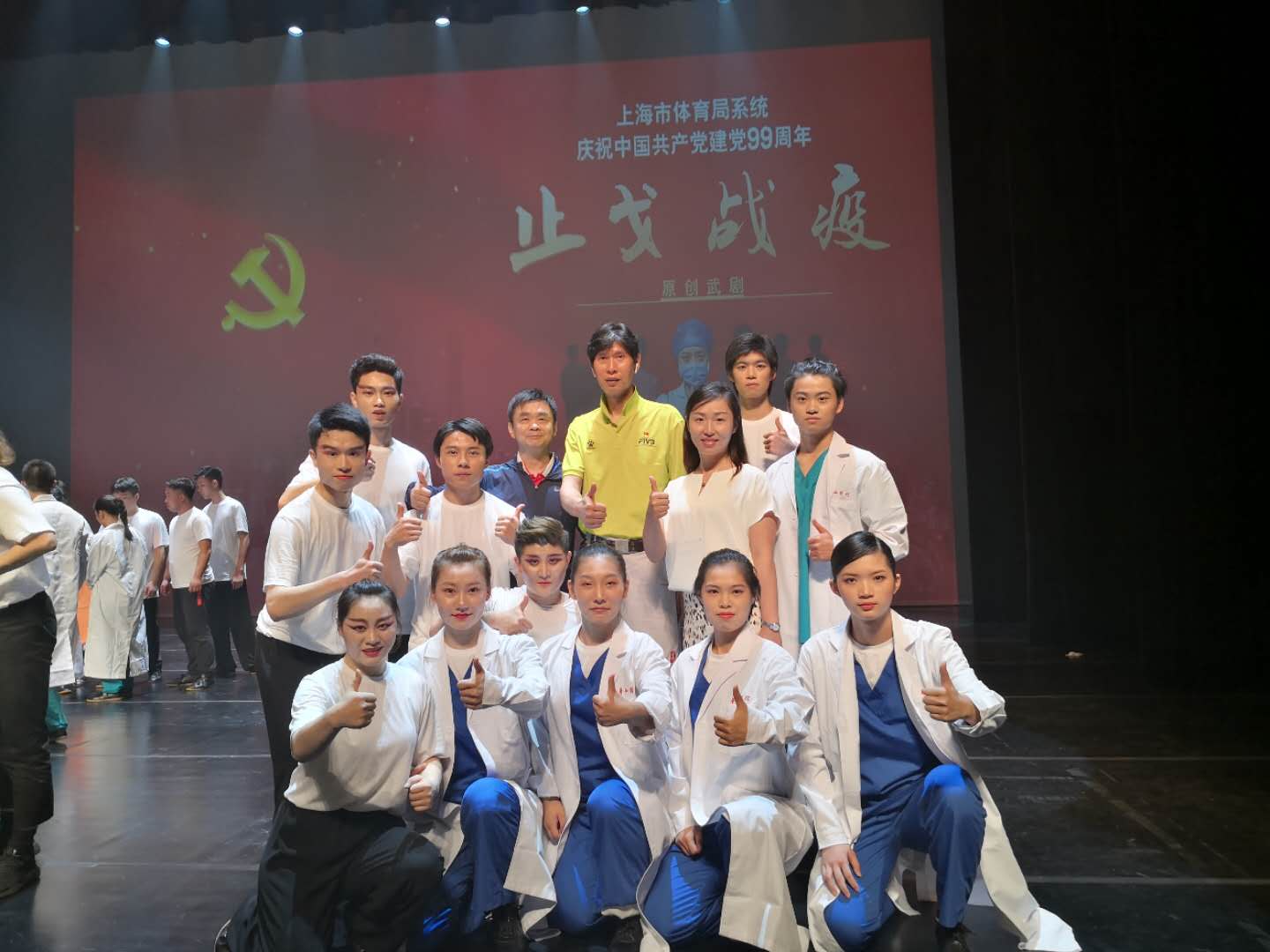 7月6日,为庆祝中国共产党成立99周年,向战斗在抗疫一线的“逆行者”们致敬,由上海市体育局牵头组织全国首个以抗疫为主题的原创武术舞台剧在上海国际舞蹈中心精彩上演。beat365体育部党支部应上海市体育局直属机关党委的邀请,参与“一支部一特色”共建活动。活动期间,《止戈战疫》节目聘请校体育部党支部宣传委员、武术队总教练陆松廷担任总导演,邀请校武术队队员共同参演。