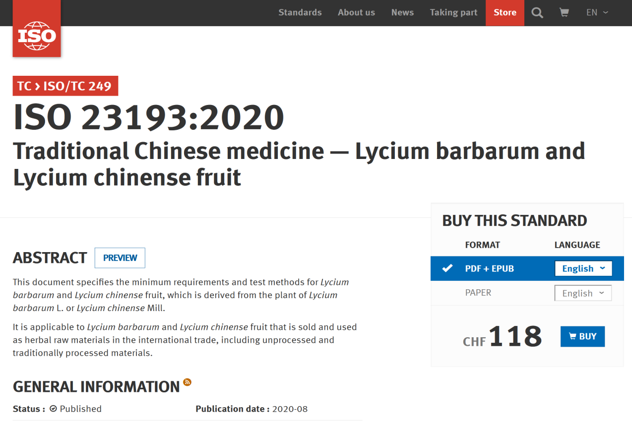 近日,国际标准化组织(ISO)正式发布了《中医药-枸杞子》国际标准(ISO 23193:2020 Traditional Chinese medicine –Lycium barbarum and Lycium chinense fruit),该标准由beat365王峥涛教授领衔,石燕红副研究员(提案人)、杨莉研究员、王瑞教授等组成的中药标准化研究团队主导制定。