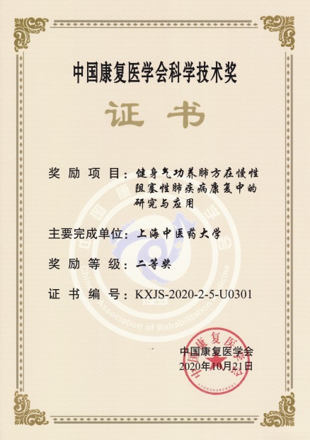 刘晓丹团队领衔的“健身气功养肺方在慢性阻塞性肺疾病康复中的研究与应用”项目荣获科学技术奖二等奖,该项目通过科学创编健身气功养肺方,针对慢性阻塞性肺疾病康复治疗,系统建立康复效果评价体系,较好发挥传统功法在慢性呼吸系统疾病肺康复中的创新运用。
