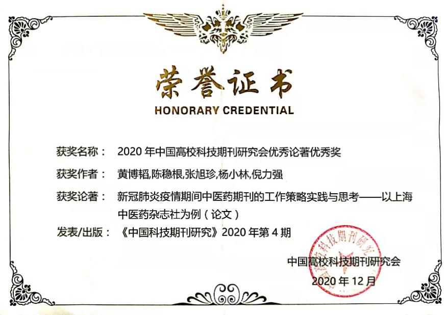 上海中医药杂志社在CSSCI期刊《中国科技期刊研究》上发表的论文《新冠肺炎疫情期间中医药期刊的工作策略实践与思考——以上海中医药杂志社为例》获中国高校科技期刊研究会“2020年优秀论著优秀奖”,入选上海市科技期刊学会“2020年优秀编辑学论文”。杂志社编辑黄博韬在中国科技期刊编辑学会、中国科学技术信息研究所、北京万方数据公司联合举办的“第18届(2020)全国核心期刊与期刊国际化、网络化研讨会”上交流的论文获得大会优秀论文一等奖。