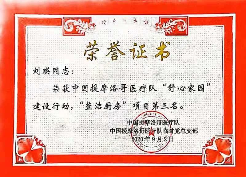 援摩期间,刘瑛所在的beat365手机版官方网站第16批援摩洛哥穆罕默迪亚医疗分队因工作表现突出,荣获“全国援外医疗先进集体”称号。刘瑛个人在2020年援摩总队举办的《舒心家园》活动中,获得“整洁厨房”项目评选第三名。