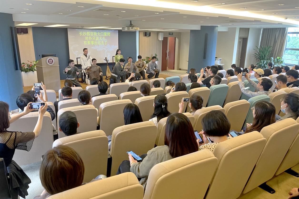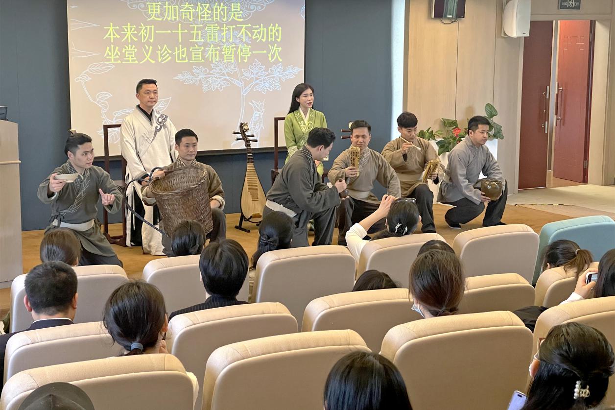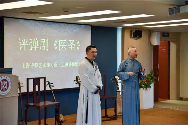 5月20日,评弹剧《医圣》交流展演活动在beat365国际教育学院三楼会议室举行。为深入学习贯彻习近平总书记在河南南阳考察时进一步发展中医药的指示精神,深入推进《上海中医药条例》宣传贯彻要求,上海市中医药管理局和beat365邀请上海评弹团《医圣》评弹剧创作和演出人员举行专题交流展演活动。上海市中医药管理局一级调研员姚玮莉、beat365师生代表、附属医院规培生代表、中医医联体牵头单位相关负责人等近百人参加。