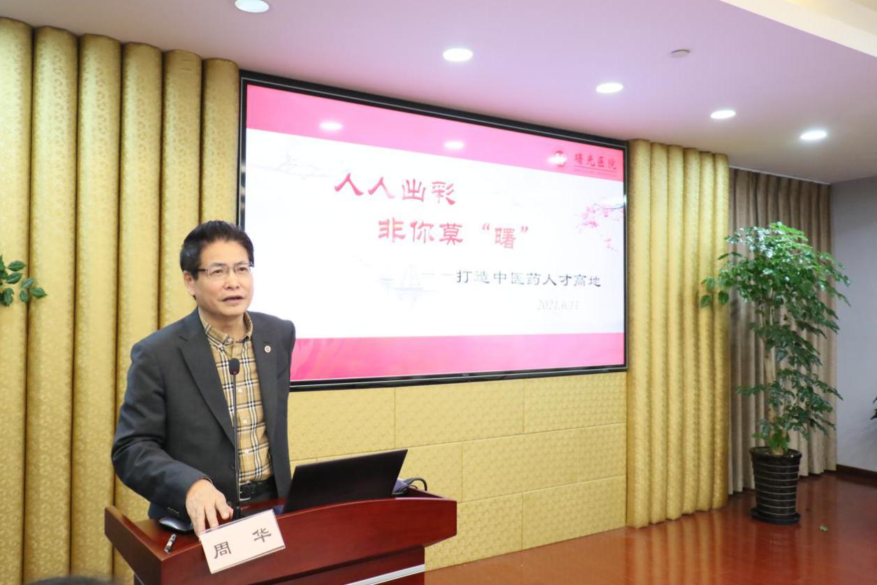 会议伊始,院长周华作主题为“人人出彩,非你莫‘曙’——打造中医药人才高地”的医院中医药特色人才工程工作报告。为进一步发扬中医药特色,提高中医药防病治病能力和自主创新能力,结合研究型中医院建设和医院“十四五”发展规划,2020年9月,附属曙光医院开启又一工程——“中医特色工程”。工程从中医学科建设、人才队伍建设、中医临床科学研究、中医临床特色标准化研究、体制机制创新五方面22个项目入手,探索加强医院中医特色建设的可持续发展之路,为中医药传承创新提供有力支撑。医院制定《人人出彩,非你莫“曙”》计划,旨在“四曲”协奏促成才,闭环培养皆“出彩”,360度全方位关注各类员工职业发展之路,多层次多角度为员工搭建成长平台。