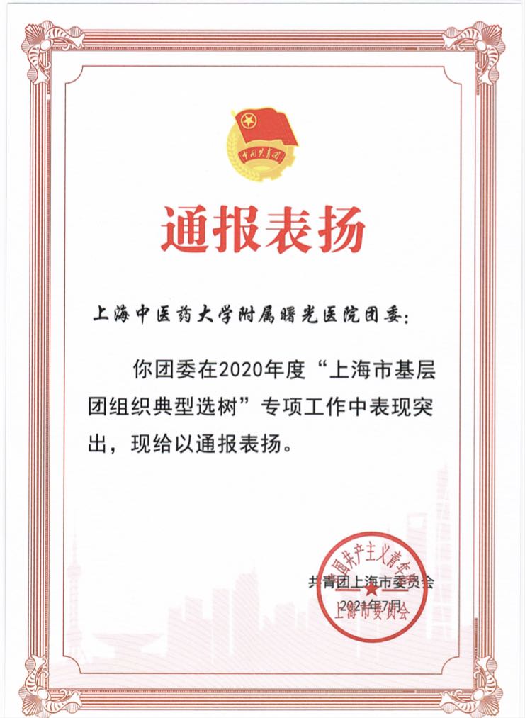 根据团市委2020年度上海市基层团组织典型选树工作安排,对标“政治建设好、组织基础好、联系服务好、作用发挥好”的选树标准,附属曙光医院团委获“2020年度上海市基层团组织典型集体”称号。