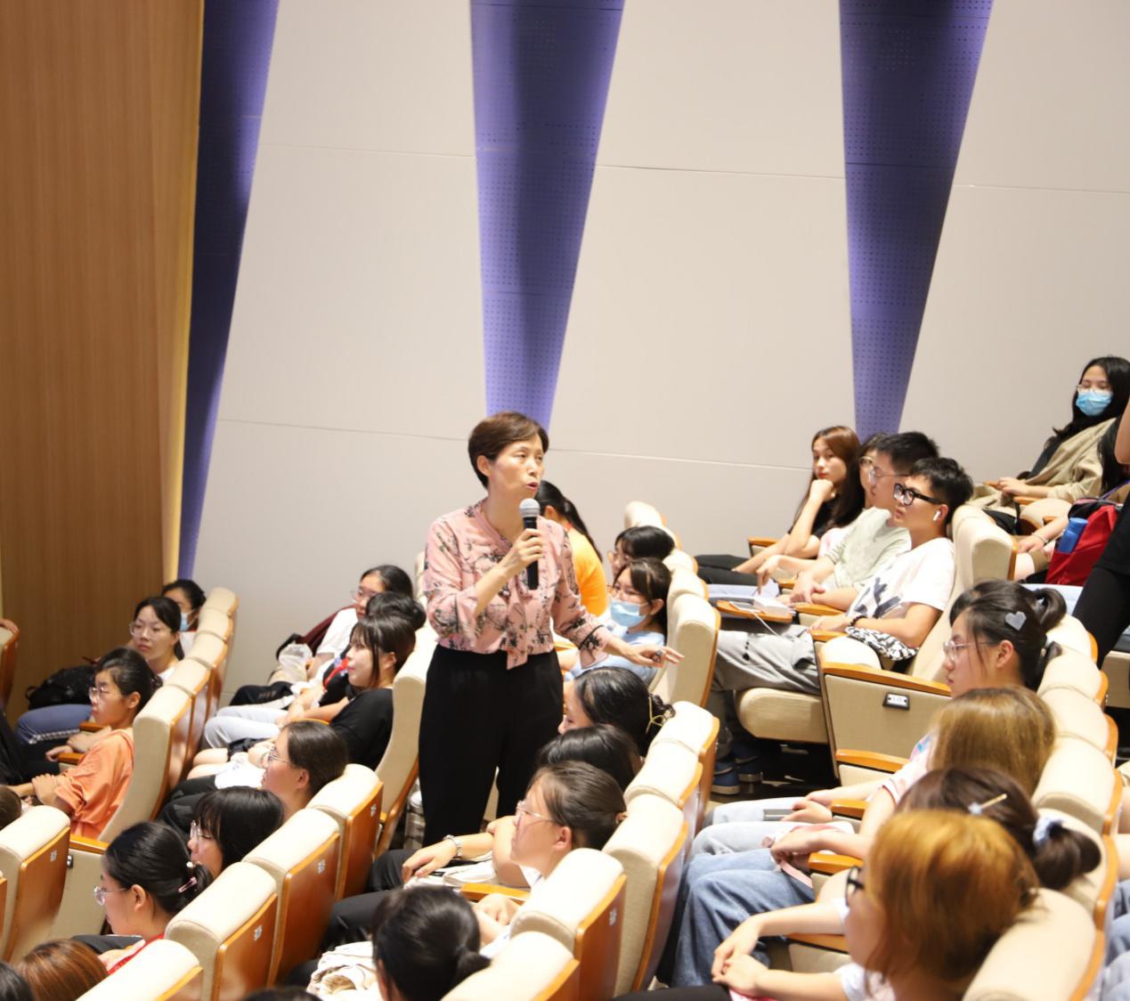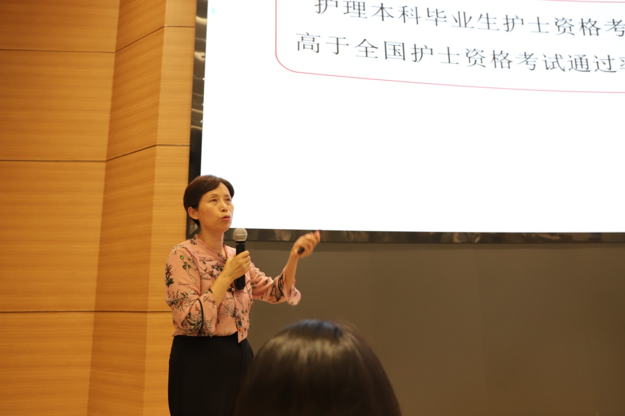 张翠娣首先介绍了学校的历史、专业课程开设、专家学者等内容,让新生了解校史、院史,激发了学生学习热情。张翠娣还给学生讲述了护理学院的师资情况、人才培养等,希望学生们牢记院训“明德、善学、悯怀、精业”,用奉献、崇高、博爱的精神成就自己的护理生涯。