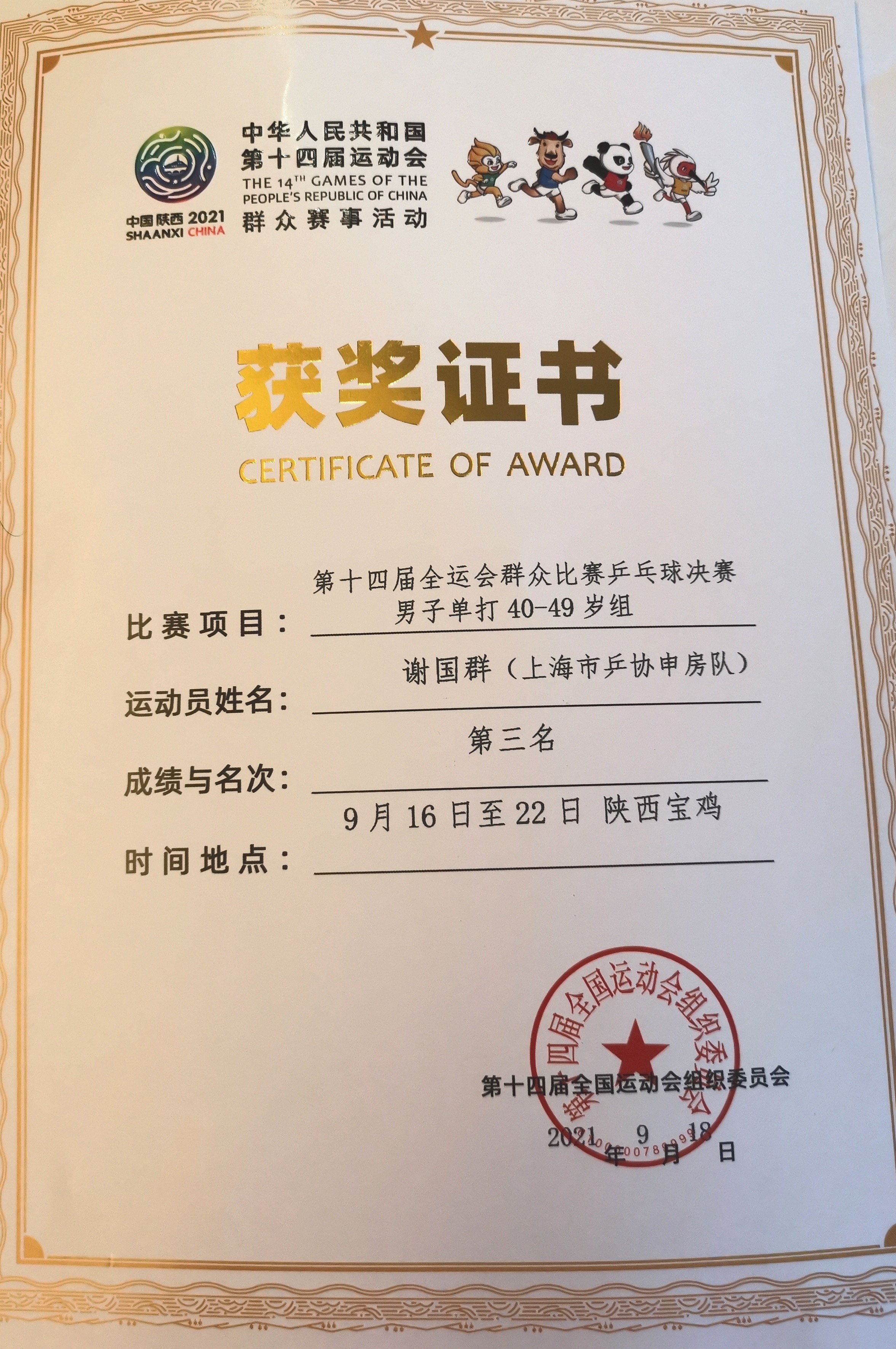 beat365公共健康学院副院长谢国群获全运会群众赛事活动乒乓球比赛铜牌