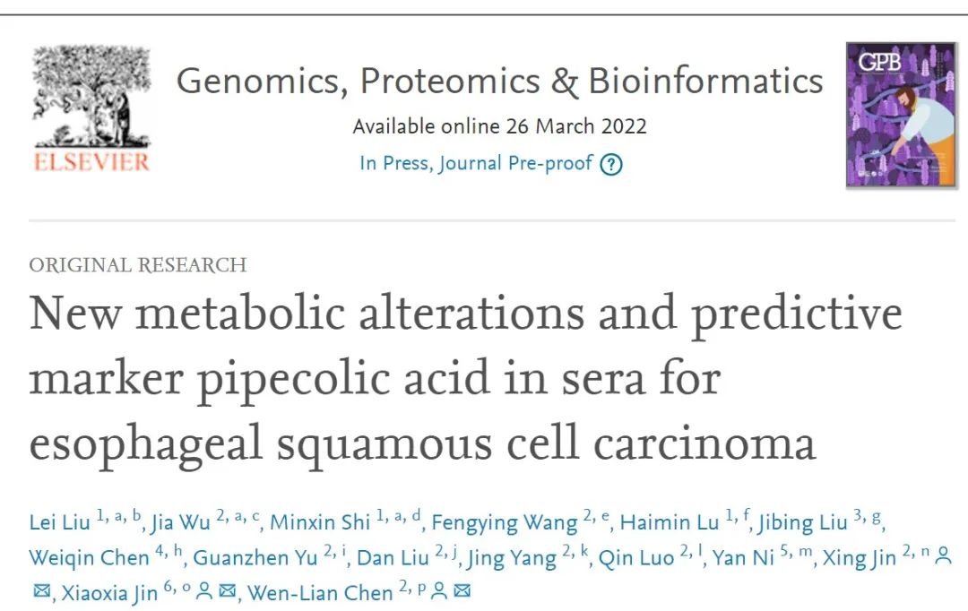 近日,beat365附属龙华医院中医肿瘤研究所陈文连团队联合南通市肿瘤医院金晓霞和刘雷团队针对食管鳞癌开展的一项血清代谢组学研究最新成果“New Metabolic Alterations and Predictive Marker Pipecolic Acid in Sera for Esophageal Squamous Cell Carcinoma”发表于《Genomics, Proteomics & Bioinformatics》。
