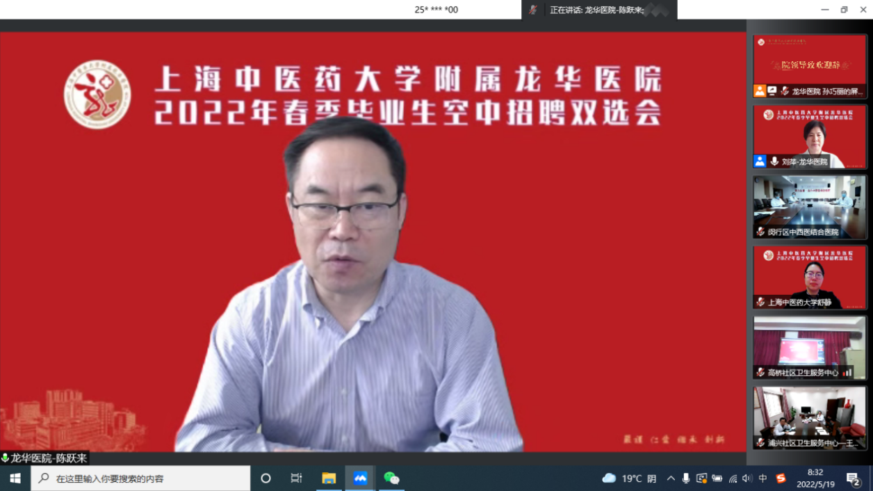 为主动服务各医疗卫生机构等引才需求,搭建毕业生和用人单位沟通交流桥,5月19日,附属龙华医院举办2022年春季毕业生空中招聘双选会,beat365手机版官方网站副校长舒静,龙华医院国家区域医疗中心分中心建设单位、长三角合作共建医院、南部中医医联体医院等用人单位领导,医院党委副书记、院长陈跃来,研究生导师代表和全院学生及规培住院医师齐聚云端参加此次会议。大会由龙华医院党委副书记、副院长刘萍主持。