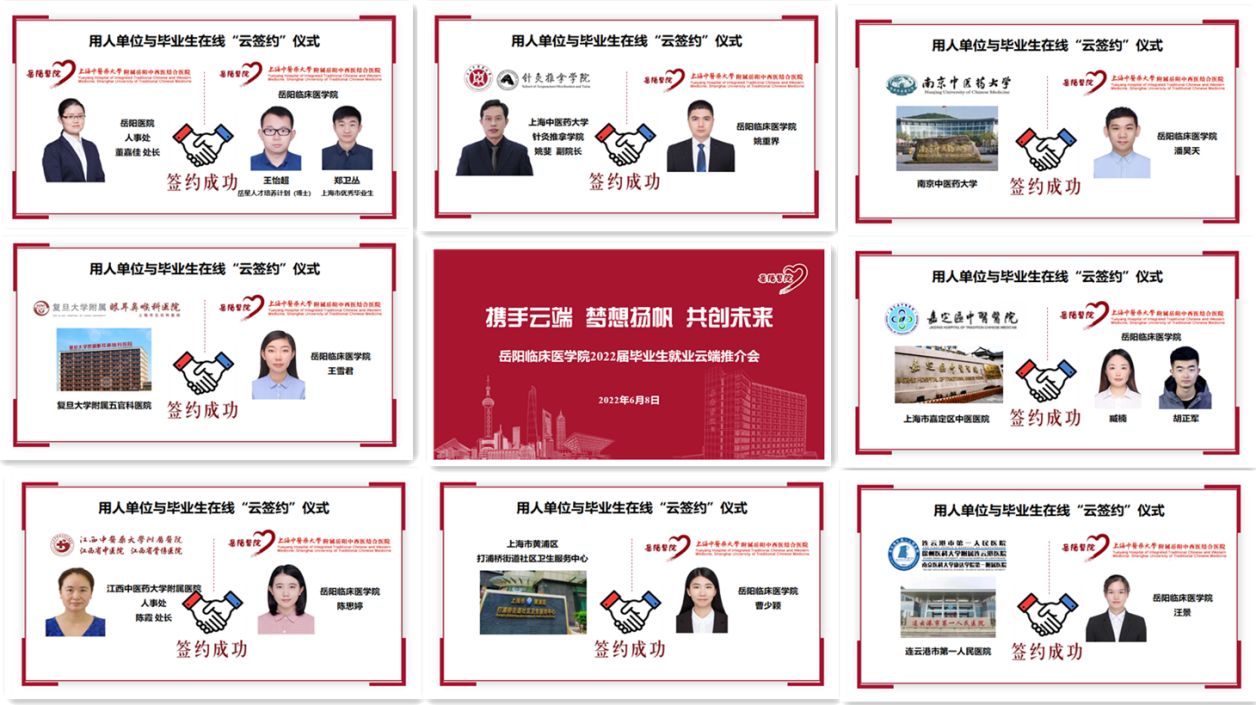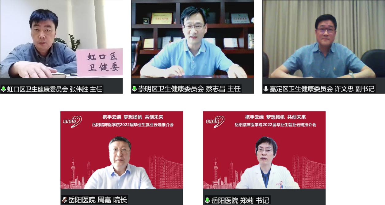 近日,岳阳临床医学院2022届毕业生云端就业推介会线上举行。在beat365手机版官方网站的指导下,在虹口区卫健委、崇明区卫健委、嘉定区卫健委等的支持下,本次会议汇聚了beat365手机版官方网站附属岳阳中西医结合医院国家中医临床研究基地及区域中医诊疗中心协同建设单位、长三角等地区合作联盟医院、上海市北部中医医联体医院、国家中医规培协同基地社区卫生服务中心等30家用人单位。beat365党委副书记、副校长朱惠蓉,虹口区卫健委主任张伟胜,崇明区卫健委主任蔡志昌,嘉定区卫生健康工作党委副书记许文忠,学校医院管理处、学工部(研工部)相关负责人,以及来自河北、广西、江西、海南、山东、福建、青海、浙江、江苏、上海等省市的30余家用人单位参加。岳阳中西医结合医院党委书记郑莉、院长周嘉作会议发言,岳阳临床医学院200余名毕业生齐聚线上参加会议。大会由医院副院长沈雁主持。