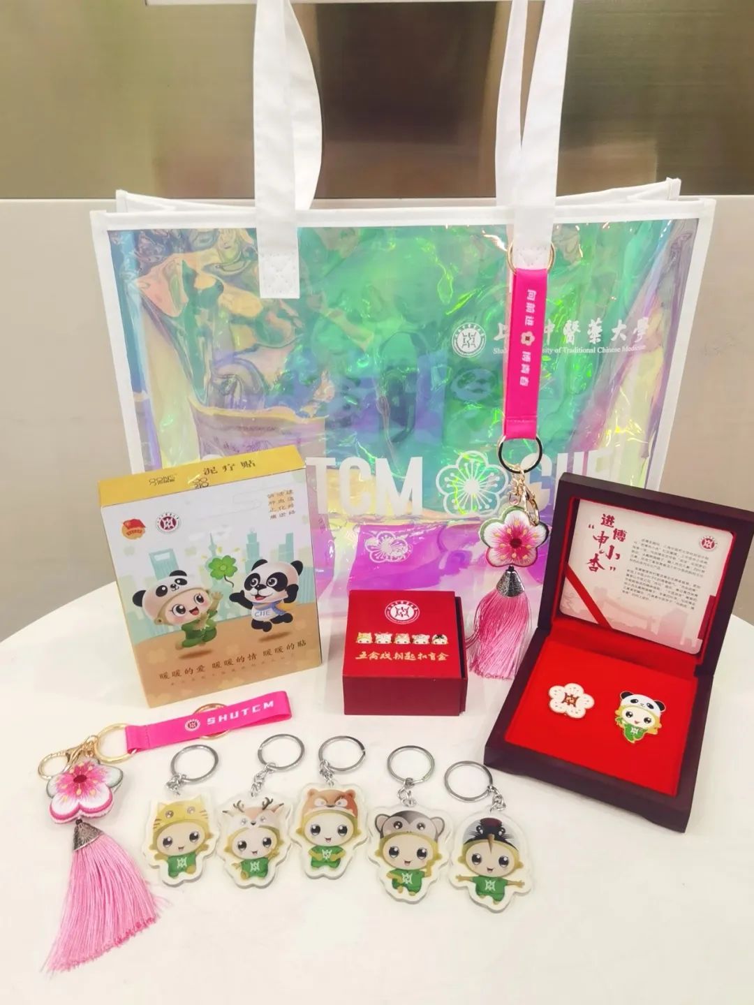 为帮助志愿者们更好地服务进博、传播中医药文化,学校为他们准备了颇具中医药特色的“礼包”,其中有中医进宝进博徽章、限定版杏花香囊、五禽戏钥匙扣盲盒、贴心温暖的泥疗贴、进博镭射包及防疫物资,为“小叶子”们的进博服务保驾护航。
