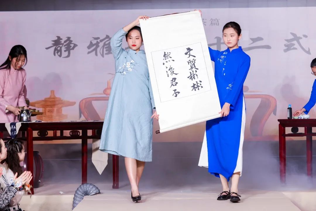 “茗赏者上也”,《礼仪中国》表演展现了茶艺、书法艺术的墨香茶韵,现场师生在欣赏艺术的同时受到潜移默化的文化熏陶。