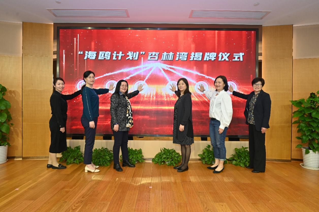 朱惠蓉、张芳、吴兰、蔡婷及学校学(研)工部副部长张瑛、团委书记万婕共同为“海鸥计划”杏林湾揭牌。