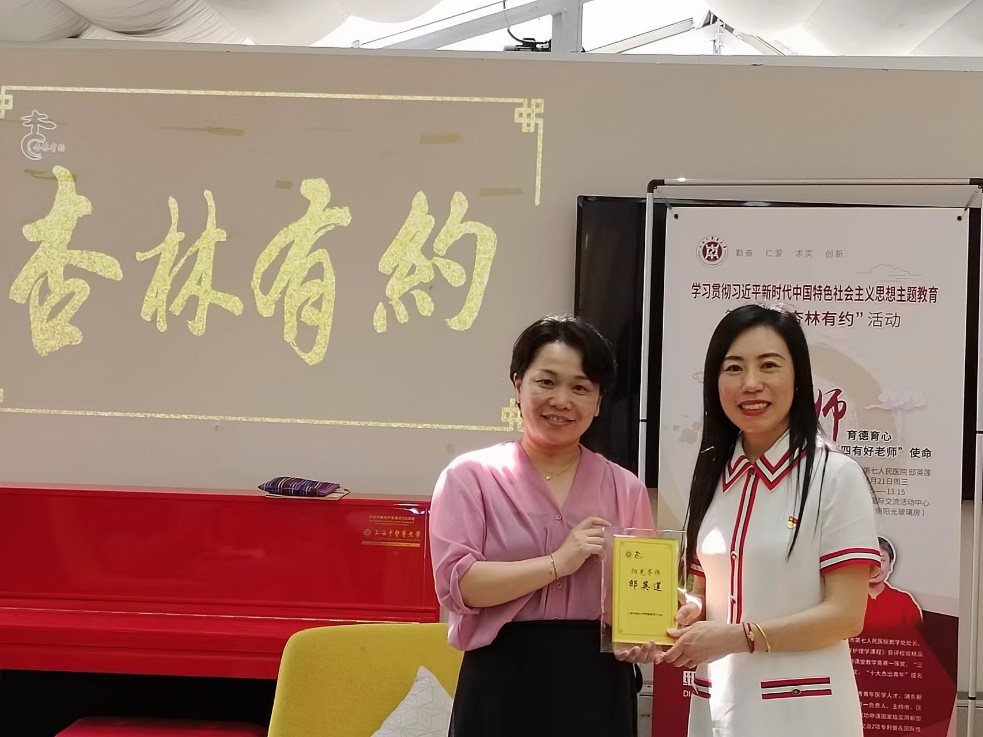 6月21日中午,第39期“杏林有约”教师午间沙龙在中药学院国际交流活动中心举办。本期沙龙特邀学校金牌教师、beat365附属第七人民医院教学处处长邸英莲,推进学习贯彻习近平新时代中国特色社会主义思想主题教育,围绕“育德育心,践行‘四有好老师’使命”这一主题与参会教师开展分享交流。宣传部(党委教师工作部)副部长刘虹主持会议,并向邸英莲颁发“阳光导师”荣誉证书。