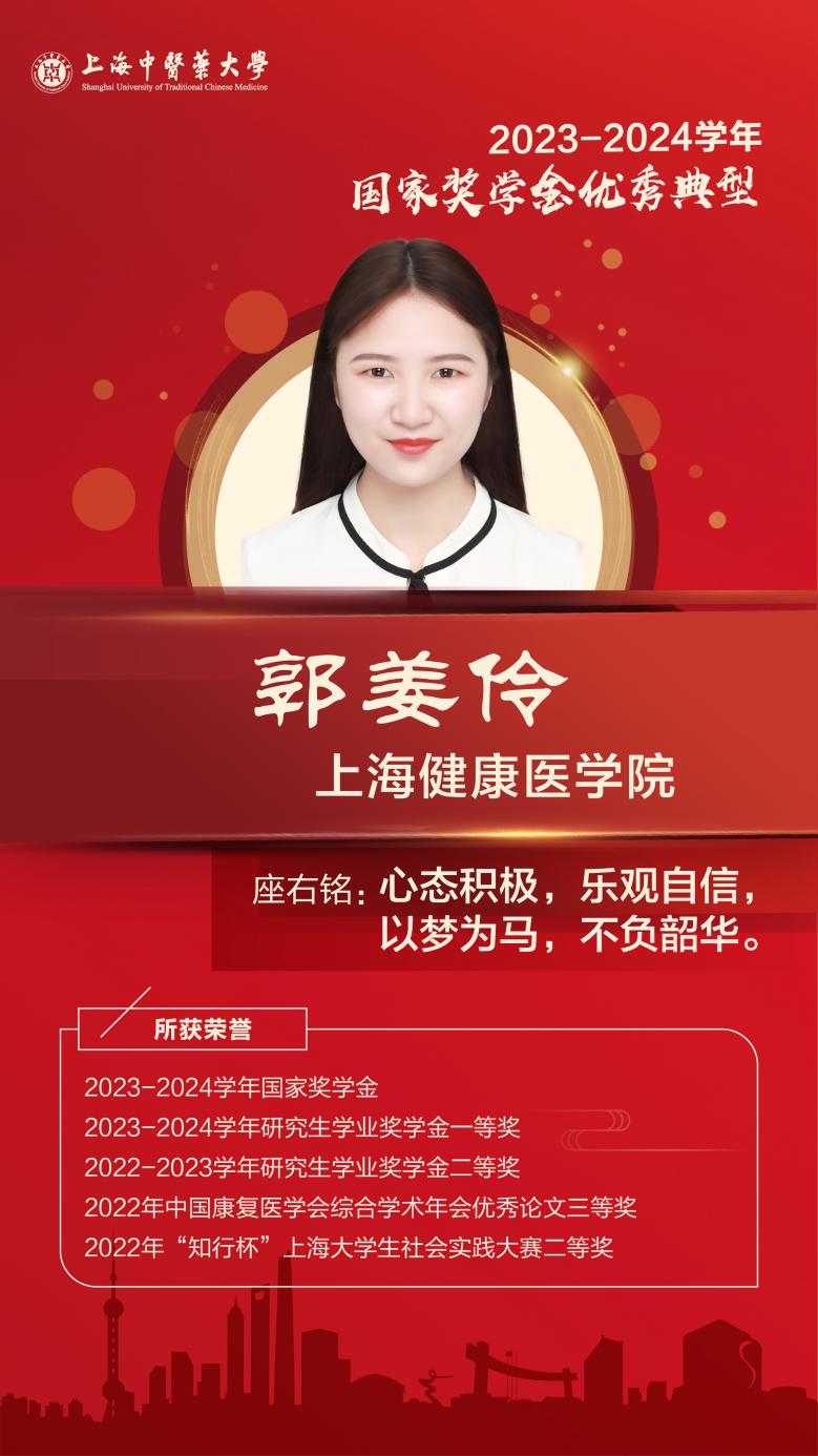 她在科研学习中严谨求实、勤奋钻研,积极探索镜像视觉反馈范式的临床运用,初步成果在中华医学会第二十三次全国物理医学与康复学学术会议上作口头报告,在导师路建伟教授的指导下,与课题组成员共同参与第18届国际物理与康复医学大会(ISPRM 2024, Sydney),完成了两项科研成果的交流报告工作;业余时间积极参与学校民乐团排练演出,荣获第七届全国大学生艺术展上海市活动二等奖,并参加中国-奥地利大学生音乐欣赏交流会等活动,积极宣传推广中医药和中国传统音乐文化;并多次参与志愿服务,尽力为他人提供帮助,协助南航乘务组成功处置急病旅客,获专信表扬,践行学以致用、回报社会、服务人民的责任与使命。