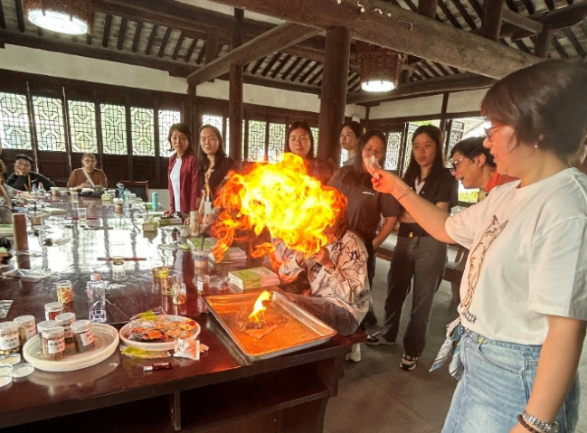 在中药饮片鉴别教学环节,光明中医医院药剂科胡爱红带来一场沉浸式的“识药课堂”。她以生动讲解和现场示范结合的方式,系统介绍中药饮片的感官鉴别方法。最令同学们印象深刻的,莫过于“海金沙火烧试验”这一教学瞬间。胡爱红取出海金沙饮片后点燃,火焰腾起。她解释:“优质海金沙易燃烧,会发生爆鸣声且有明亮的火焰。这是一种传统而实用的真伪辨识方法。”这一场面令同学们深感震撼。