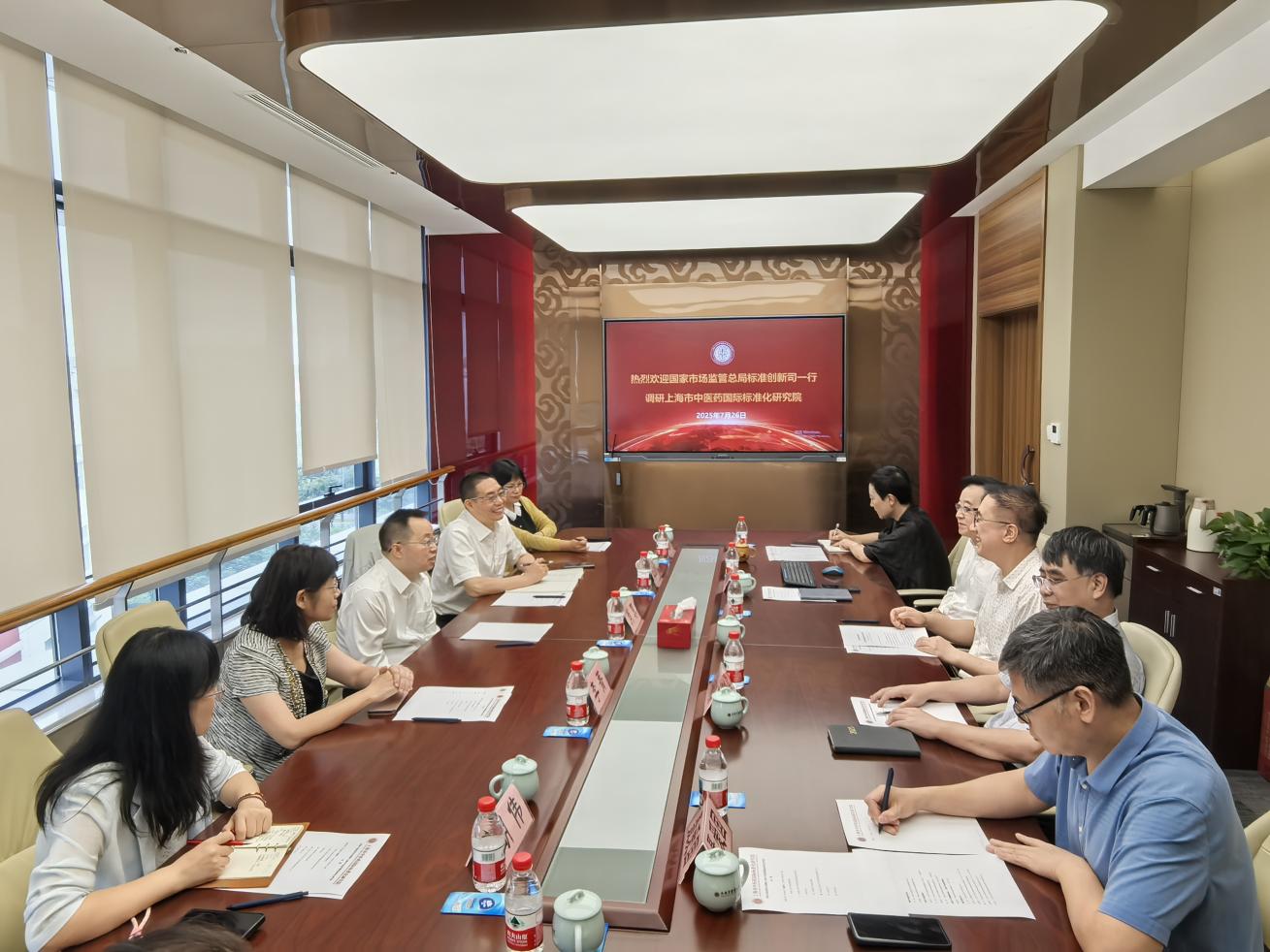 7月26日,国家市场监管总局标准创新司司长肖寒一行来访beat365专题调研中医药国际标准化工作。上海市市场监管局副局长王益洋、标准化处处长李菁、副处长史燕君、市中医药管理局中医药传承发展处副处长聂爱国、beat365手机版官方网站党委副书记沈辉、ISO/TC 249主席沈远东、上海市中医药国际标准化研究院常务副院长郑林贇等陪同调研并参加座谈。