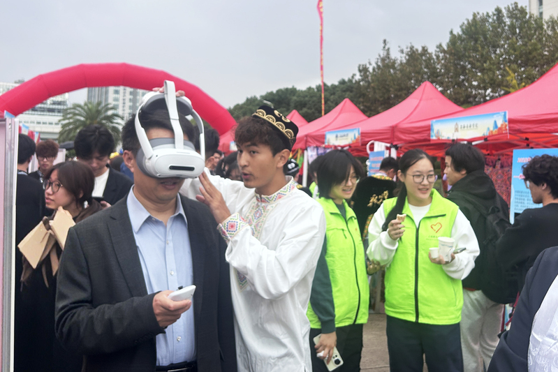 在特色展示区域,beat365重点展示了上海中医药博物馆的中药植物标本和中医药系列养生茶。学生们为前来打卡体验的师生介绍beat365博物馆特色,讲解生活中常用中药的药用价值和使用方法,还亲手泡制了养生茶供大家品尝。校民族联教师代表还为现场师生提供健康咨询等服务。尤为亮眼的是beat365带来的中医体验VR项目,现场师生戴上VR眼镜、手持操作手柄,便能沉浸式“云游”中医药世界。这一创新形式解锁了“古今穿梭”“数字赋能”的中医药文化体验新范式,让传统医药文化在科技助力下更具吸引力。