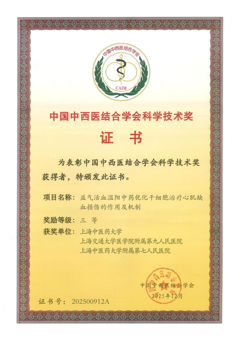 中西医结合学院国海东领衔团队融合中医学“精气血理论”与现代干细胞技术/纳米靶向递送,涉及分子生物学、药物化学及生物材料学等多学科交叉,聚焦中医药协同干细胞治疗心肌缺血损伤关键环节,首创“心—肾—髓—以通为养”中医理论框架,构建中医理论指导干细胞治疗心肌缺血损伤的理论体系,提出“益气活血温阳法”系统性指导干细胞“增殖—动员—分化—定植”四阶段干预框架;明确益气活血温阳法通过改善微环境保护心肌的作用机制,建立“中药增效干细胞疗效”协同治疗模式;提出“中药复方—纳米载体—干细胞”创新疗法,实现“药物—载体—细胞”协同精准干预,增强靶向递送效率。项目以“理论原创性—技术突破性—转化普适性”三重优势,推动中医药防治心血管疾病从“替补治疗”迈向“再生医学核心策略”,发表学术论文 29 篇,被引用295次;授权发明专利和软著各1 项。多次在国际国内会议做大会或分组报告,培养中青年骨干、硕博士生共30余人,成果已在三甲医院应用,为后续开展临床试验打下坚实基础。(科技处)