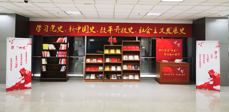 在图书馆二楼借书部设“四史”主题书架,同时设置25人左右的阅读区,并提供交流讨论区,供各基层党组织使用(预约电话:牛光辉51322614,王卓51322625)。