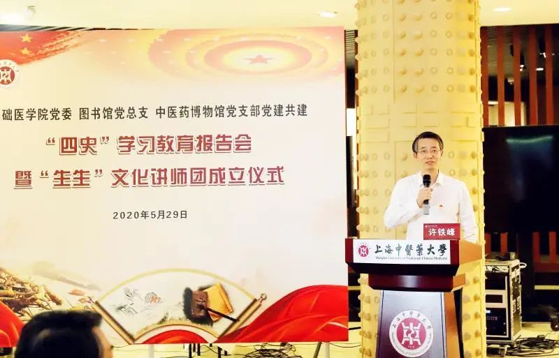 5月29日,为贯彻落实校党委“四史”学习教育实施方案要求,上好“四史”必修课,基础医学院党委、图书馆党总支和博物馆党支部在上海中医药博物馆开展“一院二馆”党建共建活动,举办“四史”学习教育首场报告会暨“生生”文化讲师团成立仪式。校党委副书记、纪委书记许铁峰出席并讲话。学校终身教授段逸山、王庆其,基础医学院、博物馆、图书馆师生党员代表参加。基础医学院党委书记陈晓主持会议。