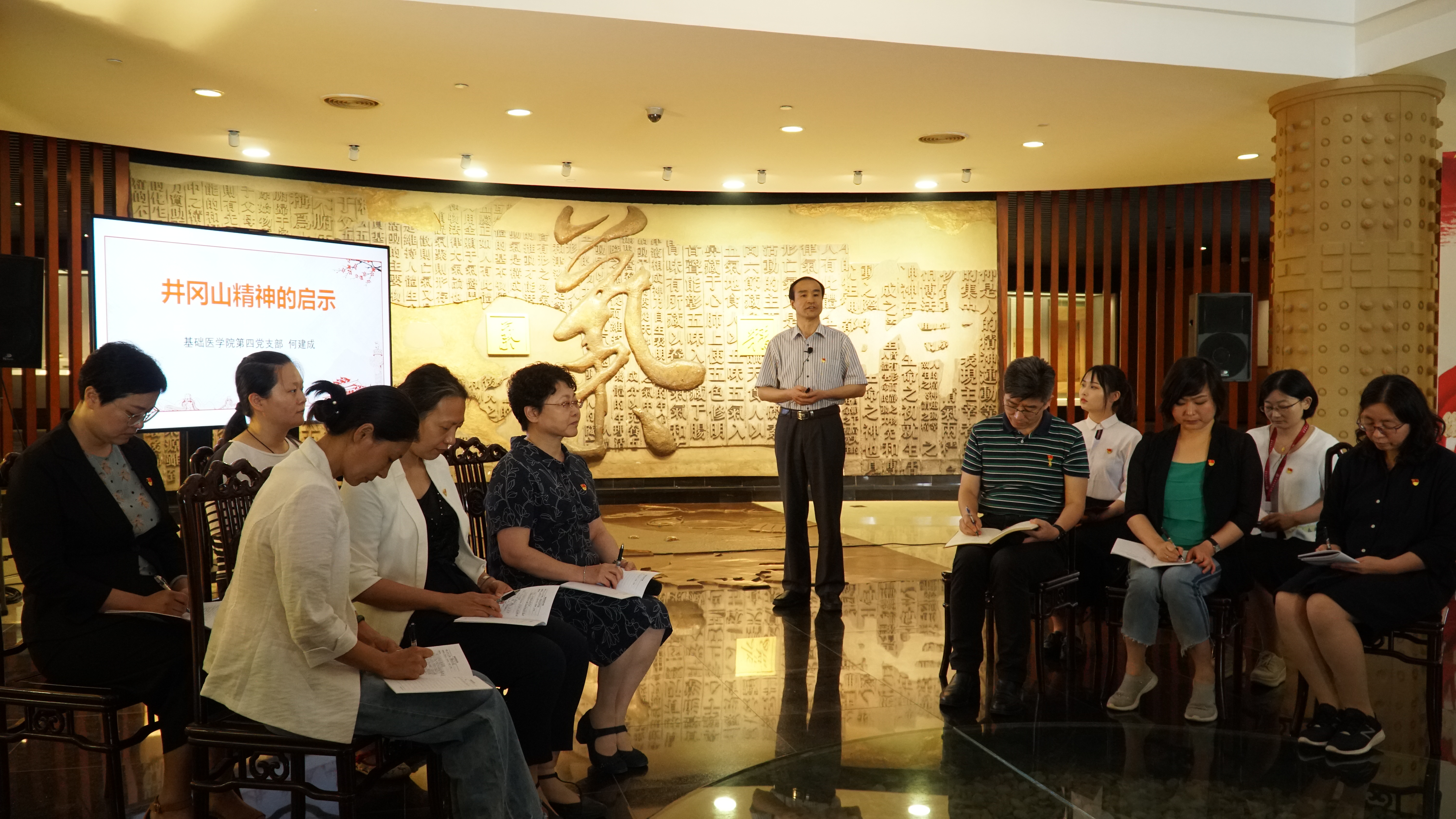随后,上海高校“双带头人”教师党支部工作室负责人、基础医学院第四党支部书记何建成教授带领支部成员重温红色历史感悟伟大精神,以“星星之火,可以燎原——井冈山精神的启示”为题,为党员师生上了一堂生动的党课。何建成说:“如果没有先烈们的浴血奋战,就不会有我们现在优越的生活环境。我们要珍惜和平年代的幸福生活,继承井冈山革命精神,坚定共产党人的理想信念,为实现中华民族伟大复兴作出应有的贡献!”老党员王忆勤教授讲述在理想信念的推动和支撑下带领郭睿、燕海霞等党员骨干教师开展ISO领域中医诊断国际标准化工作的艰辛历程。她秉承党员初心,坚守创新发展中医诊断的理想信念,带领团队艰苦奋斗,敢闯新路,在中医诊断国际标准化领域辛勤耕耘。王忆勤说:“保护中医药的国家地位,推动中医诊断国际标准化,是中医人的责任和使命。”基础医学院第四党支部党员、学院院长许家佗讲述老一代先进者费兆馥为中医的发展呕心沥血的故事,回顾中医诊断学科从无到有的过程,勉励毕业生党员志存高远、脚踏实地、勇于创新,把医者大任藏在心里扛在肩上,沿着中国特色社会主义道路一路向东,向着太阳升起的方向前进。