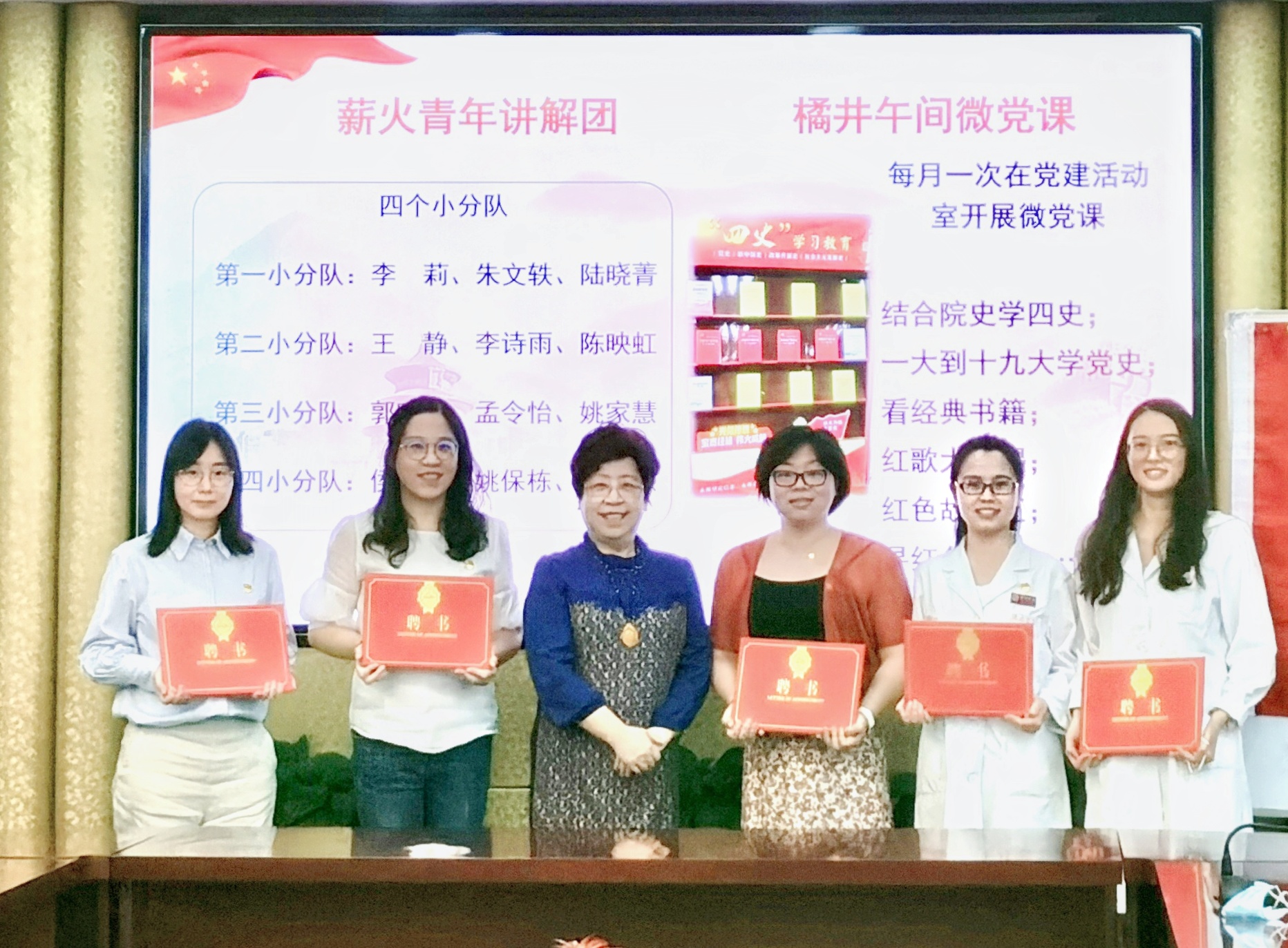 69日中午,附属曙光医院行政一支部开展“四史”学习教育动员,聘任了第一批“薪火”青年讲解团,讲解团12位成员,曙光医院党委书记马俊坚为他们颁发了聘书。讲解团成员们在去年医院举办的《伟大开端——中国共产党创建历史陈列》展览中已经讲解多次,今年中华艺术宫《“召唤”——上海市抗击新冠肺炎疫情美术、摄影主题展》再次上岗当日,讲解团会结合“四史”学习开展系列“橘井”午间微课堂。