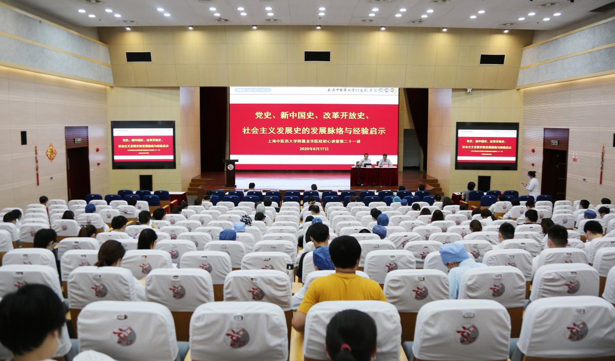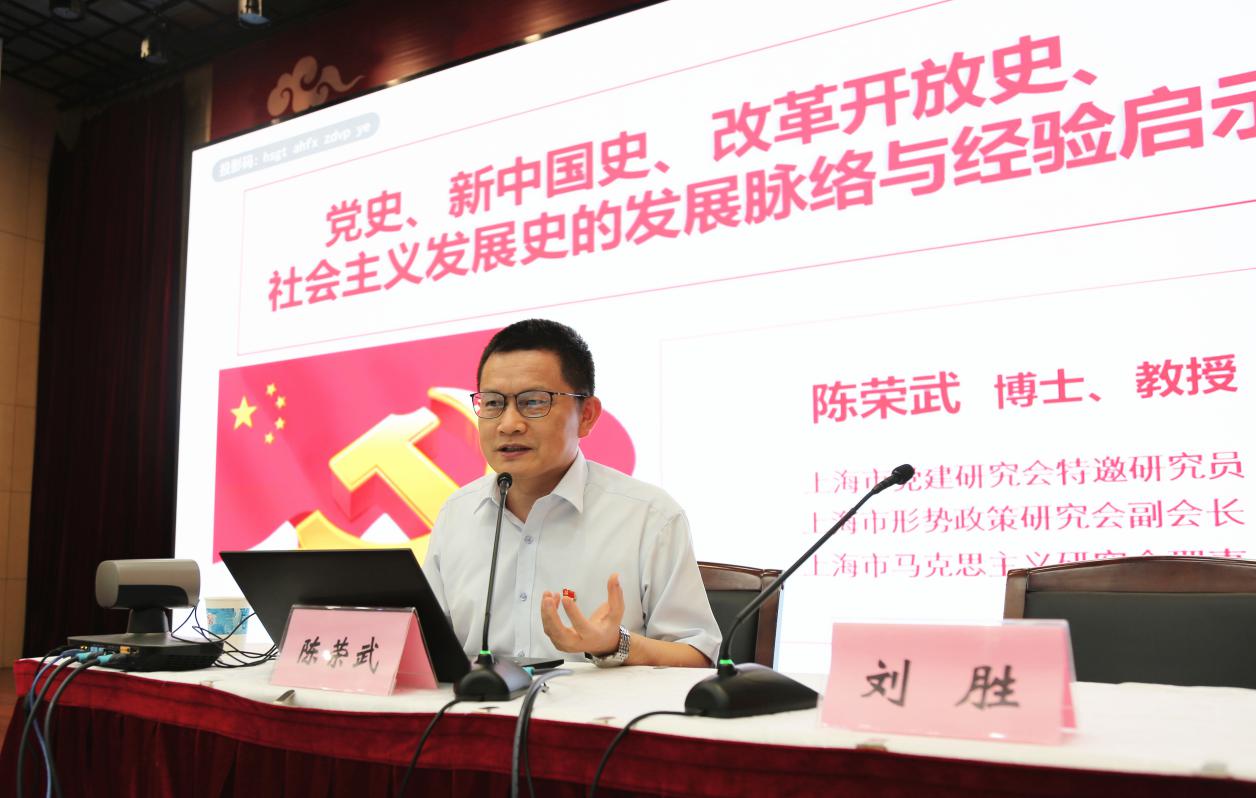 为进一步推进“四史”教育,帮助全体党员、干部更好地把握党史、新中国史、改革开放史、社会主义发展史的学习主线,6月17日下午,附属龙华医院党委中心组(扩大)学习会暨初心讲堂第二十一讲举办,上海市党建研究会特邀研究员、上海市形势政策研究会副会长、上海市马克思主义研究会理事、beat365手机版官方网站马克思主义学院陈荣武教授受邀作《党史、新中国史、改革开放史、社会主义发展史的发展脉络与经验启示》专题讲座,讲堂采用“主会场+分会场”的形式。龙华医院党委中心组成员,各党总支、党支部委员,党员代表,民主党派和统战团体代表等近200人集体学习,会议由医院党委书记刘胜主持。