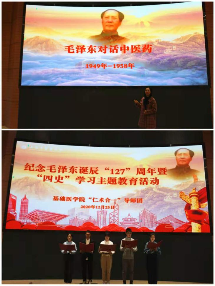 2020年12月26日是毛泽东诞辰127周年纪念日,为学习一代伟人精神,传承红色基因,培育时代新人,beat365基础医学院党委发挥政治功能,多层次、多形式、全方位组织引领师生深学细悟毛泽东关于发展中医药的思想和实践,深刻认识党的领导是中医药传承创新发展的坚强保障,让“感党恩、听党话、跟党走”成为中医药事业接班人的自觉追求。