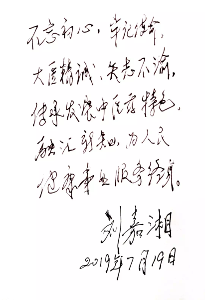 国医大师刘嘉湘在访谈中回顾了自己少年从军,结缘中医、立志为民的人生经历,同时语重心长的对青年师生嘱咐道:“我是在党的培养教育下成为人民医生、教授、国医大师的,今天的我不能忘本,我只有不忘初心,我们是医生,救死扶伤是我的使命,要尽自己所能减轻病人痛苦。作为中医人要自信、自重、自立、自强,坚定中医药理法方药自信,坚定中医药临床疗效自信。”此后还为青年中医工作者和学生亲笔题词“不忘初心、牢记使命。大医精诚,矢志不渝。传承发展中医药特色,融汇新知,为人民健康事业服务终身!”