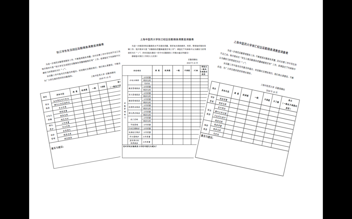 为充分了解广大师生的需求,进一步明确症结问题所在,2019年10月,后勤保障处联合学生会开展“后勤服务满意度调查工作”,调研范围包括张江校区、生活园区、徐汇校区的师生员工,共计回收有效问卷330份。经统计,2019年度后勤服务平均满意度为92.56%,同时,针对物业服务、水电维修、教室管理、食堂管理、运输服务、设备维护等各个板块的后勤保障工作,后勤保障处共收集师生意见建议51条。