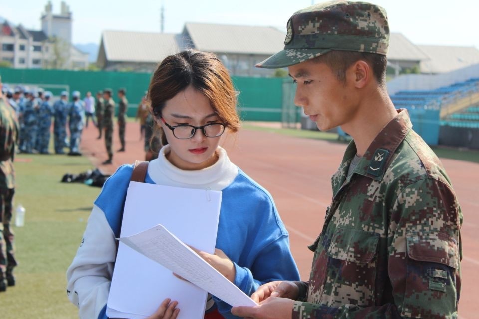 我们换上迷彩军衣,系上坚韧的腰带,伴随着清晨的第一缕阳光,满怀信心,阔步向前。这个秋天的军训少了夏日中的烈阳,少了汗流浃背的衬衫,却没有缺少温暖的关怀。在我们在太阳底下站军姿时,学姐们送来了第一杯果茶,也给我们带来了秋天的第一份温暖;当然,我们也遇到了可爱的教官,训练中的教官十分严厉,对我们的军姿等一些基本动作反复指导与纠正。正是教官的严格让我们感受到军人的不容易,这也是一次磨练意志与毅力的很好机会,只有经过铸造才能成为一块好钢!听着铿锵有力的口号,走着整齐划一的步伐,时刻体会军人的作风,虽然艰苦但却十分难忘。所谓有苦也有甜,我们感受到了军训中教官的严厉,也见到了私下教官们可爱的一面,有着5G冲浪的教官们用着流行语和我们交谈,休息的时候也会给我们放一些流行歌曲带动我们活跃气氛,平时训练表现好也会得到教官的糖果......这个过程有欢声笑语也有着声声“哀嚎”。军训几天的我们周围已经没有了白皙的皮肤,增加的只是脚上的酸痛的肌肉,但是我们依然相信,通过艰苦的训练,我们会成就一个崭新的自己。