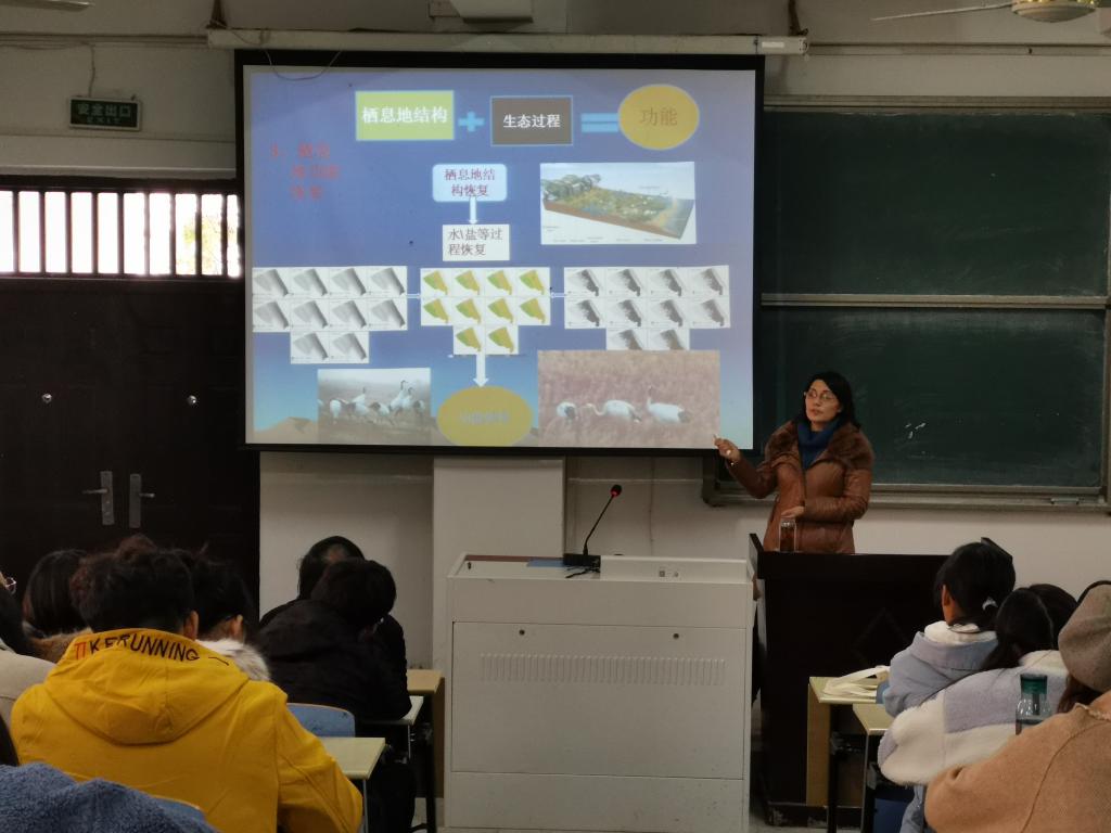 刘红玉教授以丹顶鹤为例,用风趣简洁的语言,深入细致地阐述了丹顶鹤现状分布、生物学及文化特征,分析了丹顶鹤面临威胁及其保护意义,全面阐释了栖息地恢复结构模式的全新理念。报告让我院师生耳目一新、受益匪浅。师生互动环节,同学们积极向刘教授请教和提问,刘教授进行了耐心的回答和讲解。