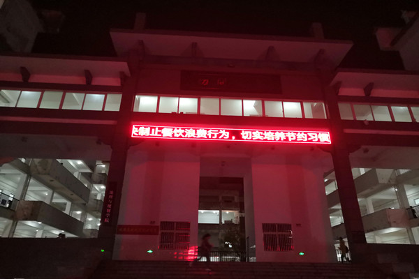 学院博文楼楼宇LED电子屏一直循环滚动播放宣传语“坚决制止餐饮浪费行为,切实培养节约习惯。”“一粥一饭当思来之不易,一丝一缕恒念物力维艰。”营造了浓厚的宣传氛围。