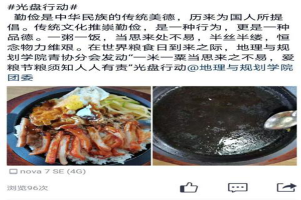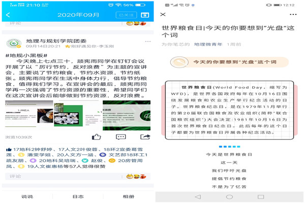 学院微博、微信等新媒体平台推送《世界粮食日—今天的你要想到“光盘”这个词》等博文,并发起读者讨论,呼吁广大师生杜绝浪费,从我做起。