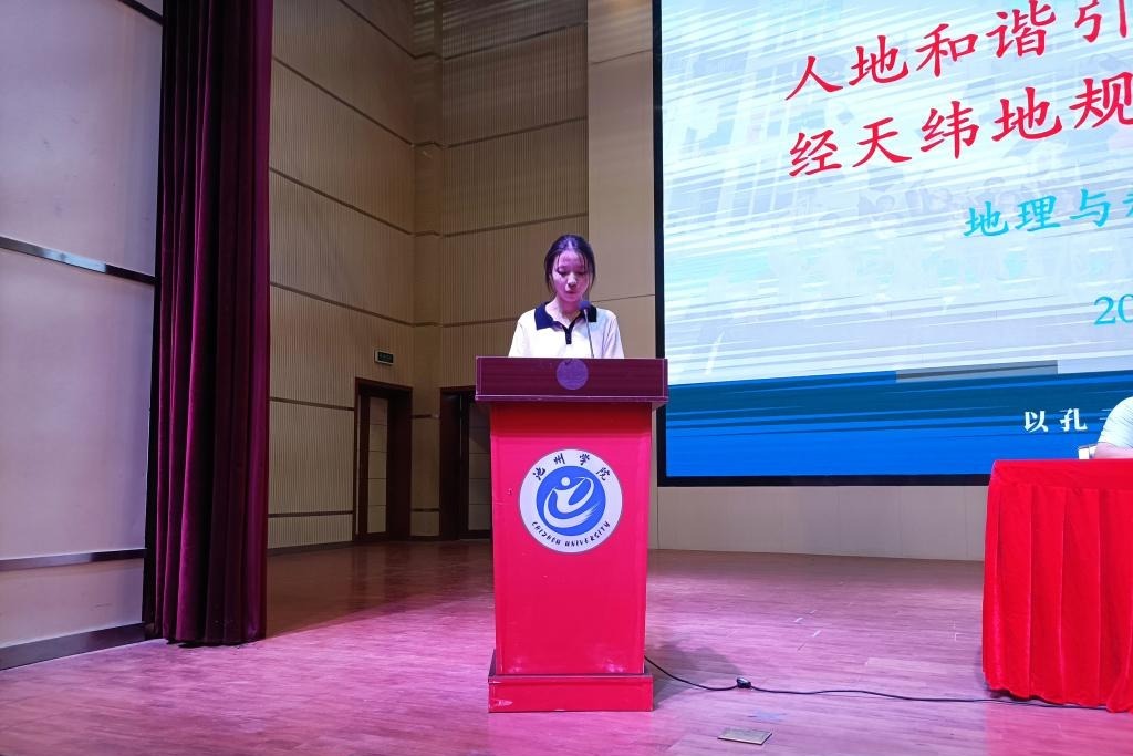 2021级地理科学专业汪晔同学代表新生发言,她表达了对大学生活的期待,同时表示将尽快适应大学生活,全面发展,不断完善自我。