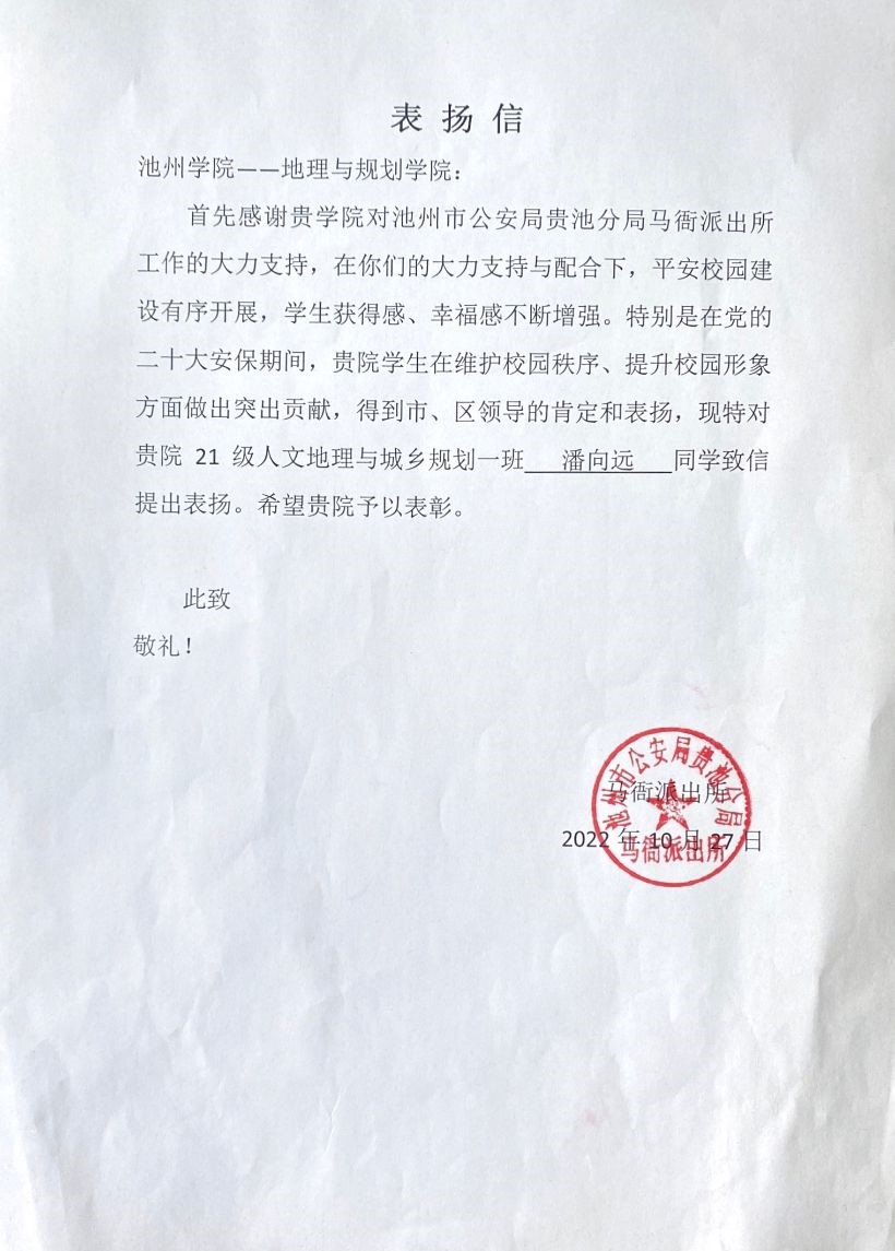 近日,3044am永利集团3044noc21级人文地理与城乡规划一班潘向远同学获得马衙派出所致信表扬,表扬潘向远同学在维护校园秩序、提升校园形象方面做出的贡献,同时感谢学院对马衙派出所工作的大力支持。