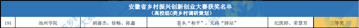 2月24日,2022年安徽省乡村振兴创新创业大赛(省级B类赛事)评审结果公布参赛作品《茶乡“和平”,天路“驿站”》荣获三等奖。(参赛学生胡盛杰、徐畅、陈鑫,指导老师纪凯婷、荣慧芳)。