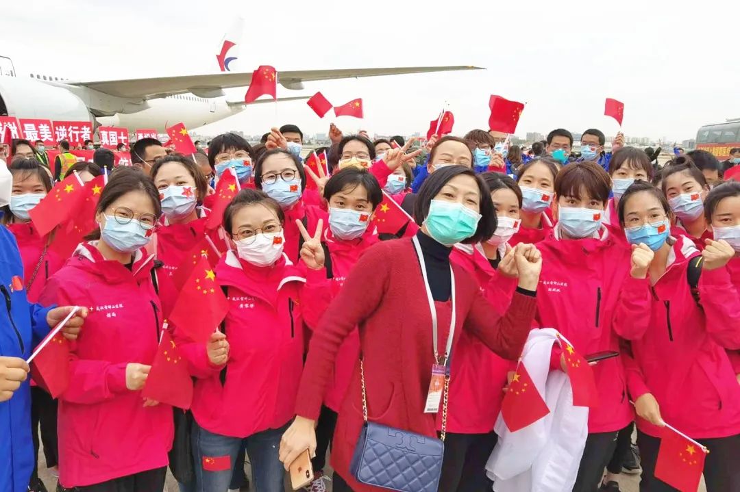 欢迎援鄂队员们回家!第七人民医院党委书记徐玉英、院长王杰宁到机场迎接凯旋的援鄂英雄。