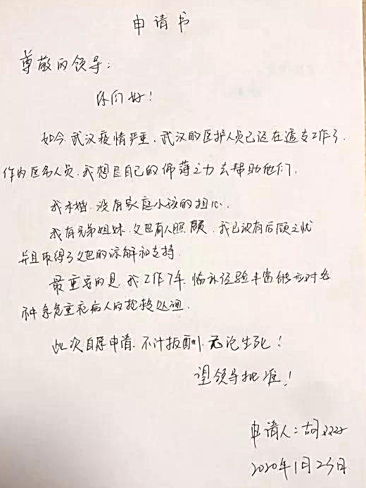 “我未婚,没有家庭小孩的担心。我有兄弟姐妹,父母也有人照顾,我已没有后顾之忧,并且取得了父母的谅解和支持。最重要的是,我工作7年,临床经验丰富能应对各种急危重症病人的抢救处理。此次自愿申请,不计报酬,无论生死!望领导批准。申请人:胡双双。”