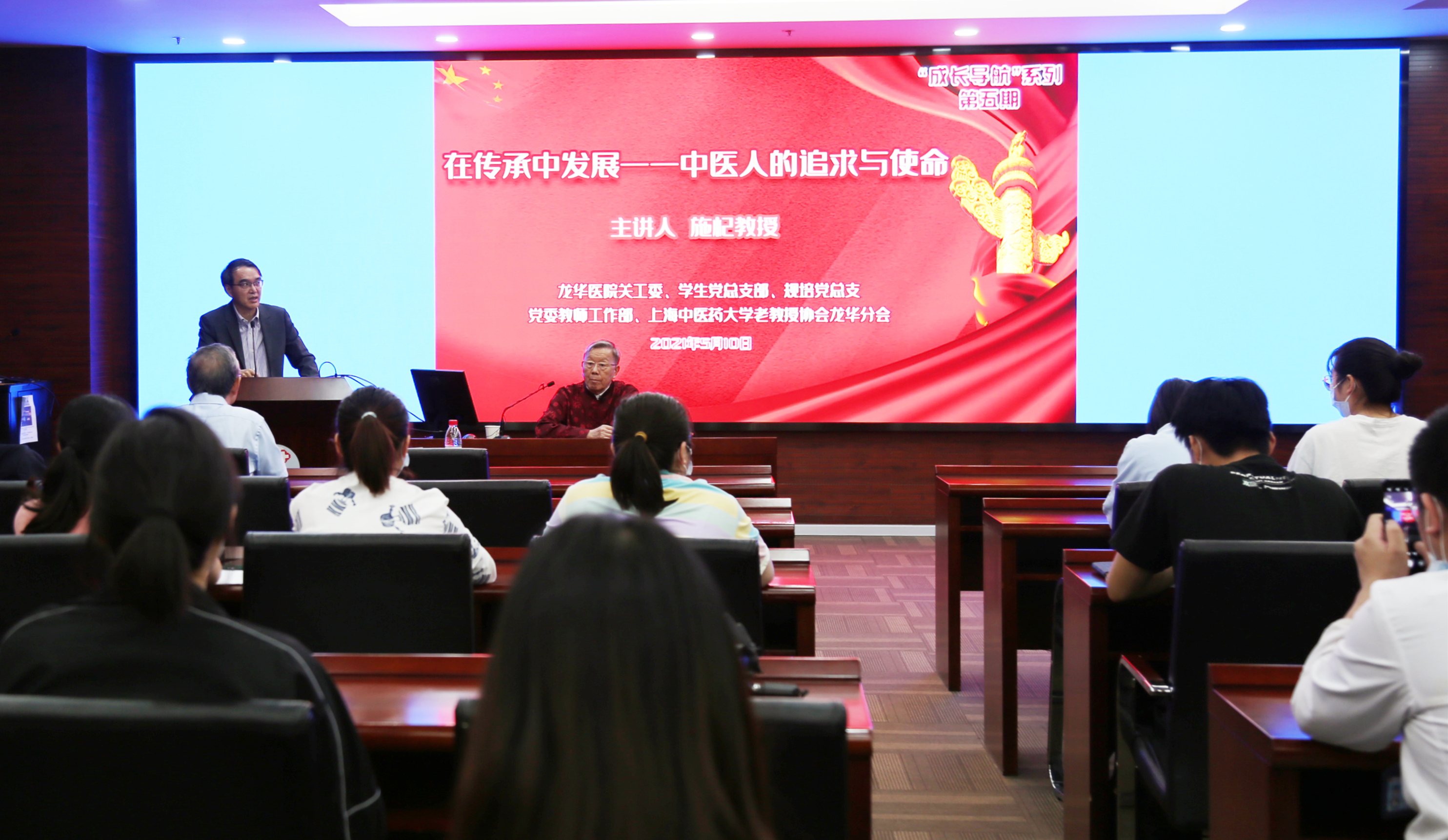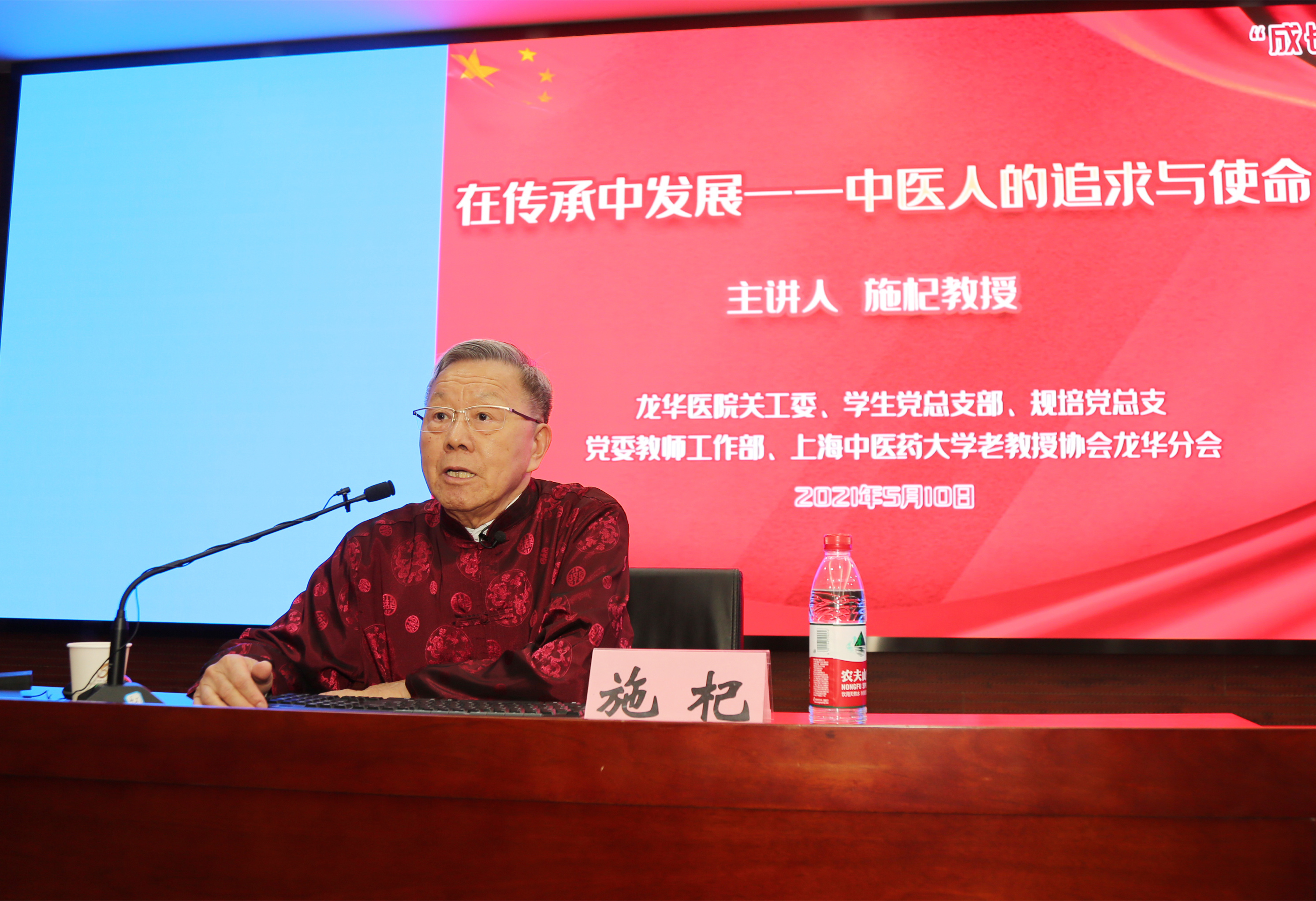 迎接建党100周年,围绕党史学习教育,充分发挥医院老专家、老教授关心下一代成长的作用,5月10日下午,附属龙华医院关工委、学生党总支、规培党总支、党委教师工作部、beat365手机版官方网站老教授协会龙华分会联合举办的“岐黄名家讲故事”第三期活动在医院12号楼一楼会议室举行,邀请上海市名中医、beat365手机版官方网站终身教授、龙华临床医学院服务学生成长导师团“启德明智导师团”团长施杞教授作《在传承中发展——中医人的追求与使命》主题讲座,讲座由龙华医院党委书记刘胜主持,医院相关职能部门负责人以及青年医师、学生党员和规培住院医师党员等参加。