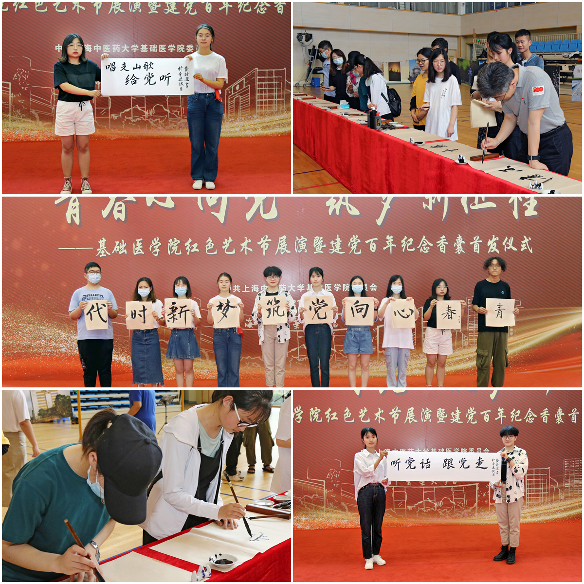 红色艺术节展演在少数民族预科班学生朗诵红色家书《李大钊 青春》中拉开序幕。武术《闻鸡起舞》,展现当代大学生努力练就过硬本领、锻炼强健体魄,争做堪当大任的时代新人。优秀摄影作品展示、书法快闪、三行情书展示依次进行,多维、立体呈现出中医学子用实际行动献礼建党百年的决心。许家佗、何建成为毕业生党员赠送以优秀摄影作品制成的明信片及建党百年纪念香囊,勉励毕业生党员牢记初心使命,建功新时代。红色艺术节在师生合唱《唱支山歌给党听》中落幕。