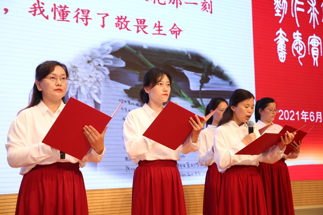 来自各条线的青年教师们结合党史学习教育体会共提交20个演讲作品,大会遴选了9个优秀作品,围绕“薪火相传心向党”“青春筑梦新时代”“启智润心担使命”“铸魂育人守初心”四个篇章,向台下300多名师生代表进行现场展示。青年教师们以演讲的形式传递铿锵力量,表达赓续红色基因铸魂育人的决心。