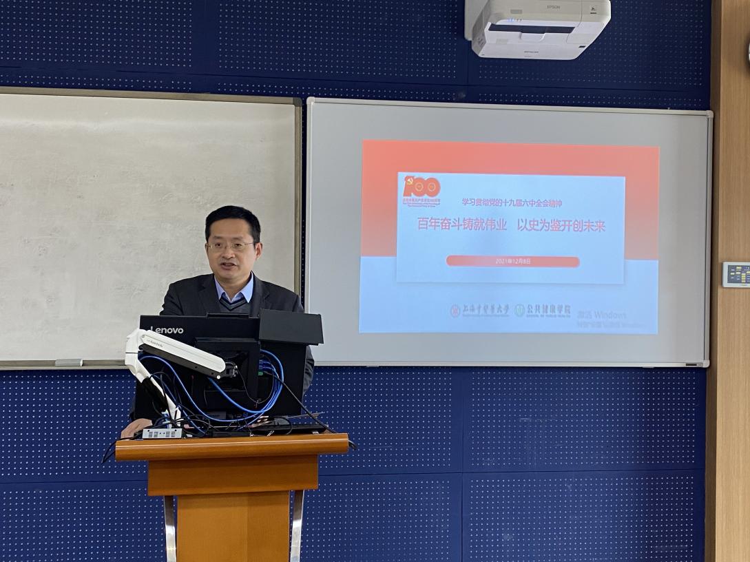 为进一步开展党史学习教育,深刻领会党的十九届六中全会精神,12月8日下午,公共健康学院党总支在6302举行政治理论学习会,专题学习党的十九届六中全会精神。浦东区委党校党建研究中心讲师郑智鑫受邀以《百年奋斗铸就伟业,以史为鉴、开创未来——学习贯彻党的十九届六中全会精神》为题作讲座。学院全体教职工、学生党员、入党积极分子等100多名师生参加。学习会由学院党总支副书记、院长赵海磊主持。