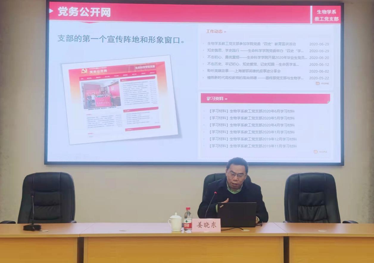 12月10日上午,华东师范大学生命科学学院生物学系教工党支部书记姜晓东作《新时代党支部建设的实践探索与思考》讲座,以自身支部书记工作经验,从实际出发,拓展基层党建工作思路。