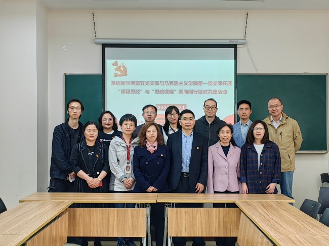 为全面深入学习贯彻习近平新时代中国特色社会主义思想,进一步贯彻习近平总书记在全国高校思想政治工作会议上的讲话精神,421日上午,基础医学院第五党支部与马克思主义学院第一党支部开展“课程思政”与“思政课程”同向同行结对共建活动。